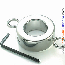 Splitball-Cockring from polished stainless steel with 2 hooks for weights. The hooks can be unscrewed. Weight 377gr. Internal diameters 3.5 cm.